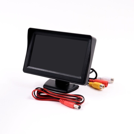 Данный монитор оснащён 4,3-дюймовым цветным жидкокристаллическим дисплеем, размещенным в пластиковом корпусе. Корпус дополнительно оборудован двумя композитными входами для видеосигнала (AV1 – белый RCA и AV2 – желтый RCA) и одним входом питания типа «Штекер» d5,25мм (красный разъем). Все разъемы закреплены на поворотной ножке-основании.