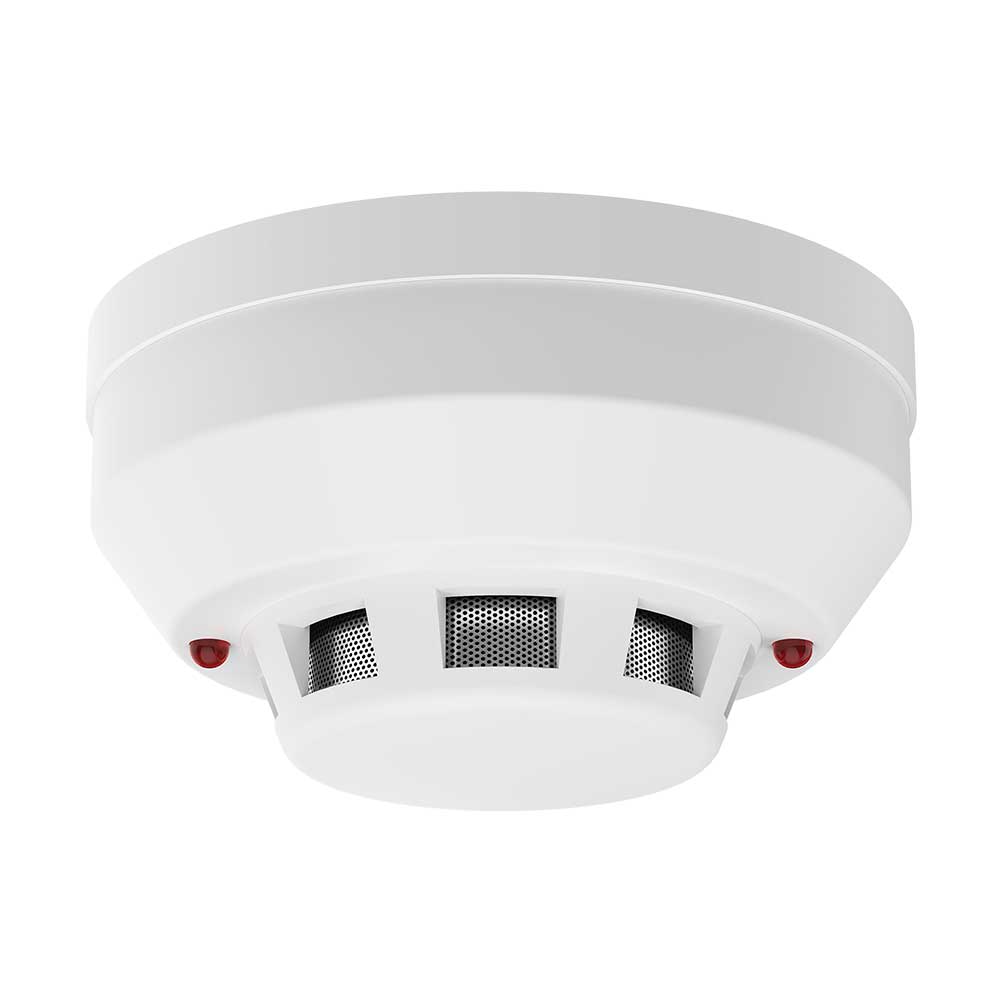 Датчик дыма Rubetek ИП 212-101 подает сигнал на контрольную панель по проводной линии связи.