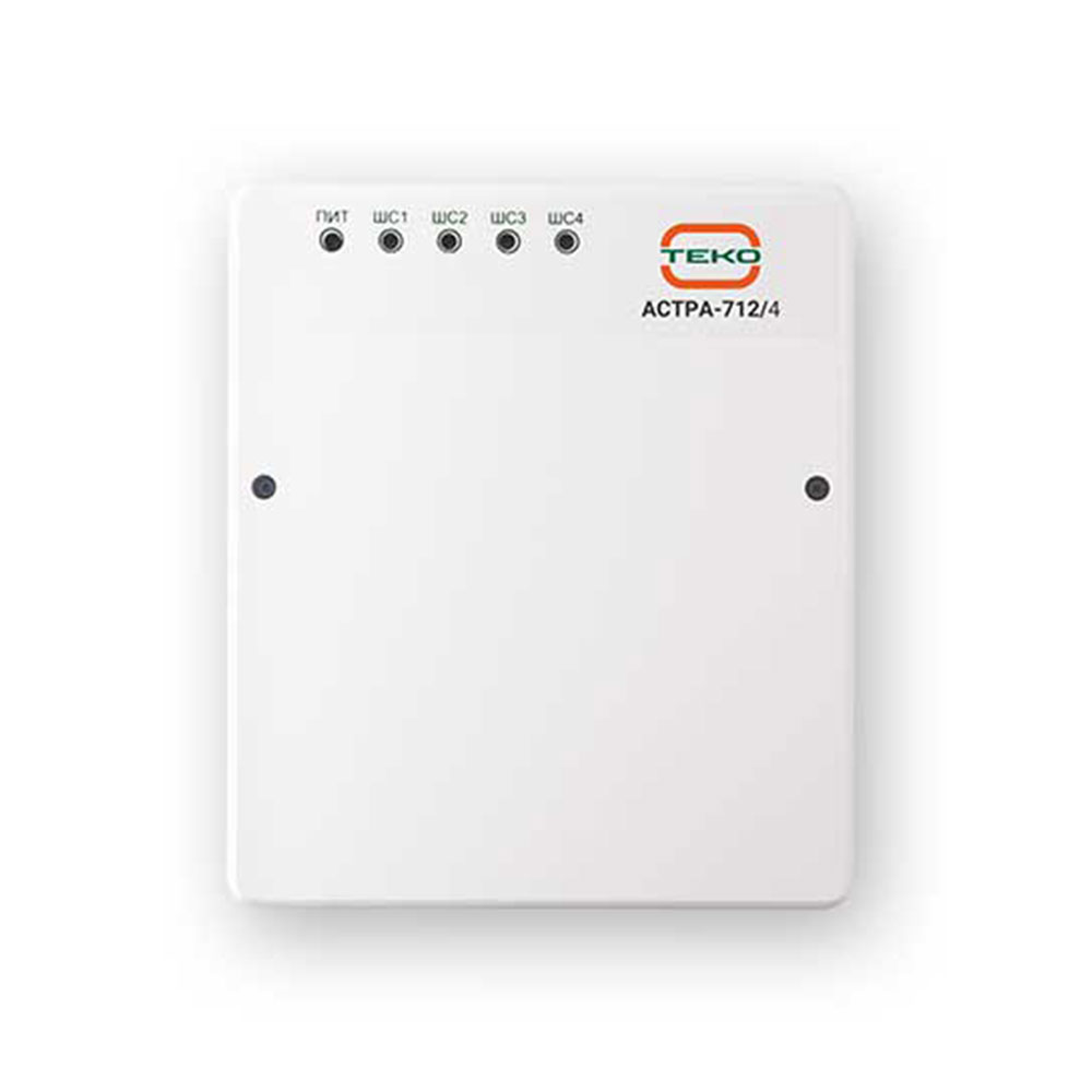 Панель управления «Теко» «Астра-712/4» контролирует состояние четырех шлейфов сигнализации (ШС) с подключенными охранными или технологическими извещателями, управляет средствами оповещения, отправляет тревожные уведомления на ПЦН через релейные выходы, передает информацию по линии расширения на релейные блоки «Астра-822», блоки индикации «Астра-861», радиопередающее устройство УОО «Астра-Y», обеспечивает питанием активные извещатели и др.