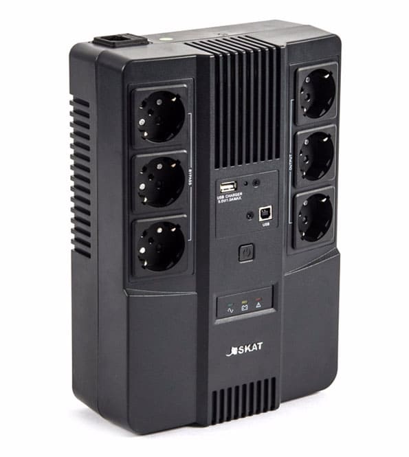 Skat-UPS 800 AI оснащен входным разъемом с плавким предохранителем, двумя сетевыми портами RJ-45, USB-портом, световой и звуковой индикацией работы ИБП. Рабочие температуры — +5 ºС… +40 ºС. Защита от пыли и влаги — IP20. Размер — 200×290×93 мм, вес — 5.3 кг.