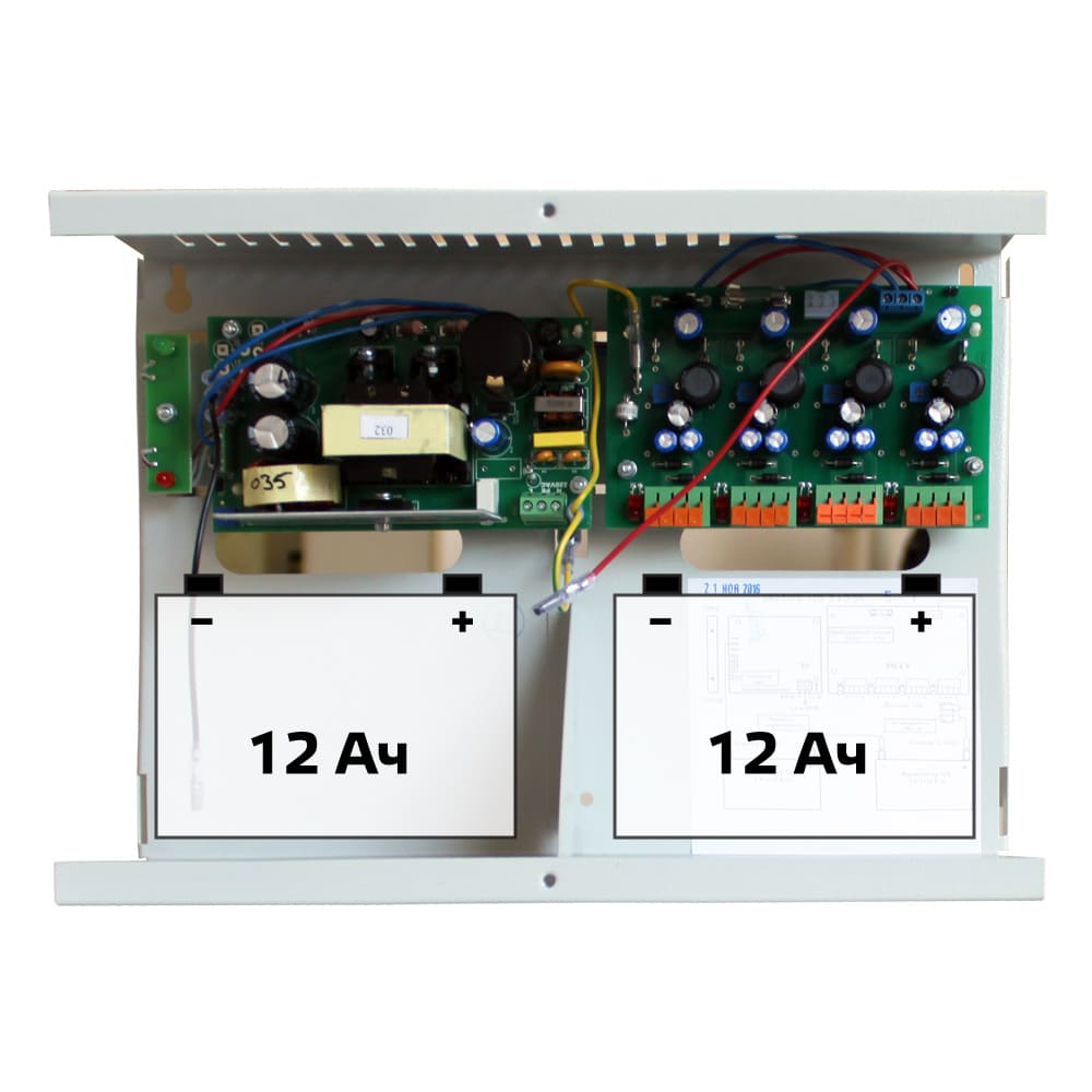 В корпусе Skat-V.8 предусмотрено место для двух герметичных свинцово-кислотных батарей с напряжением 12 В и емкостью 7 А·ч ~ 12 А·ч (в комплект не включены). Суммарное номинальное напряжение АКБ — 24 В, после зарядки — 27 В. Источник питания укомплектован платой преобразователя напряжения PN-V.8, входным предохранителем (6.3 А), аккумуляторным предохранителем (5 А), клеммами подключения сети, выходов и АКБ, индикаторами сетевого питания и напряжения на преобразователях выходов. Потребляемая мощность без нагрузки — до 20 ВА. Рабочие температуры — –10 ºС… +40 ºС. Размер — 315×220×123 мм, вес — 2.6 кг. В комплект входит плавкая вставка ВПТ6 6.3А 250 В и аккумуляторная перемычка.