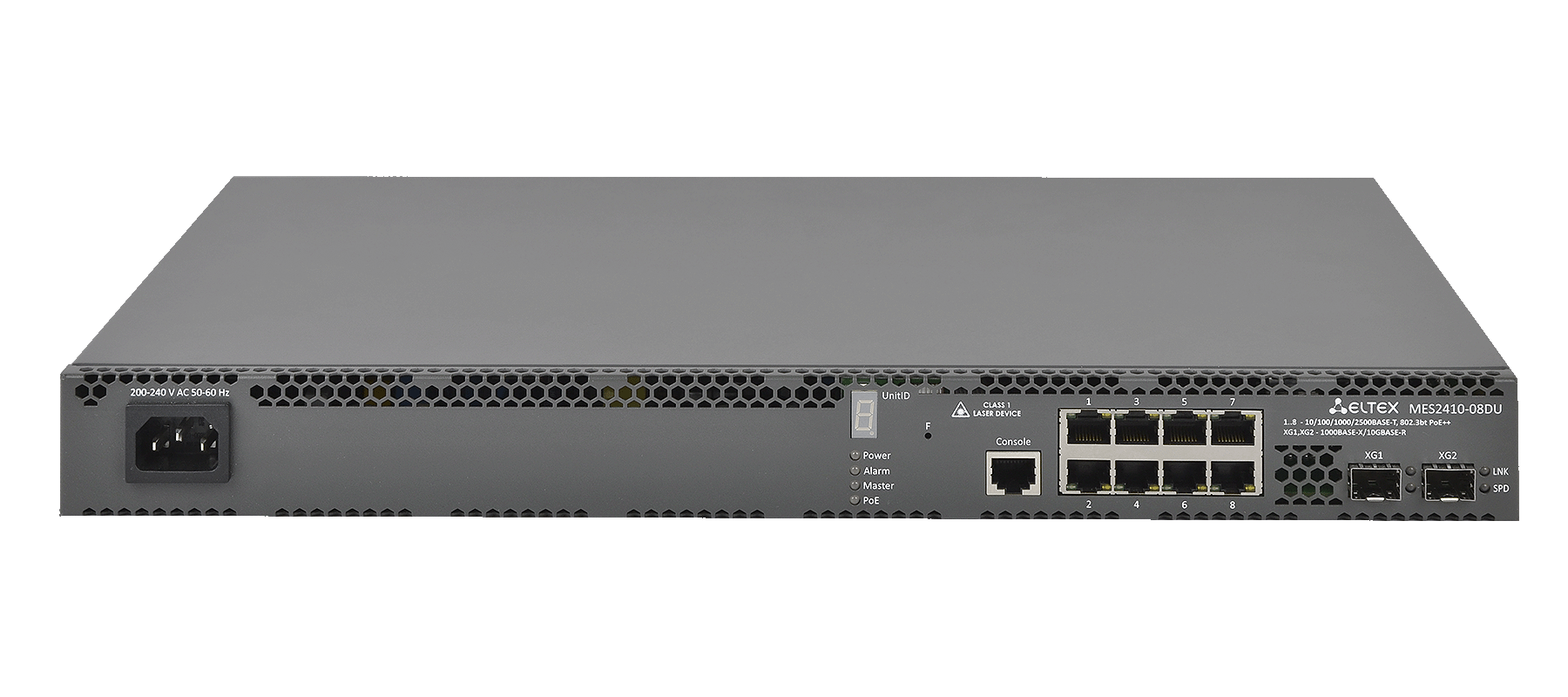 Модель MES2410-08DU поддерживает технологию Power over Ethernet (PoE) в соответствии со стандартом IEEE 802.3bt/PoE++, что позволяет подавать питание до 90 Вт на порт. Коммутаторы серии MES2410 также поддерживают функции виртуальных локальных сетей (VLAN), многоадресной рассылки (multicast) и обладают расширенным набором функций безопасности.