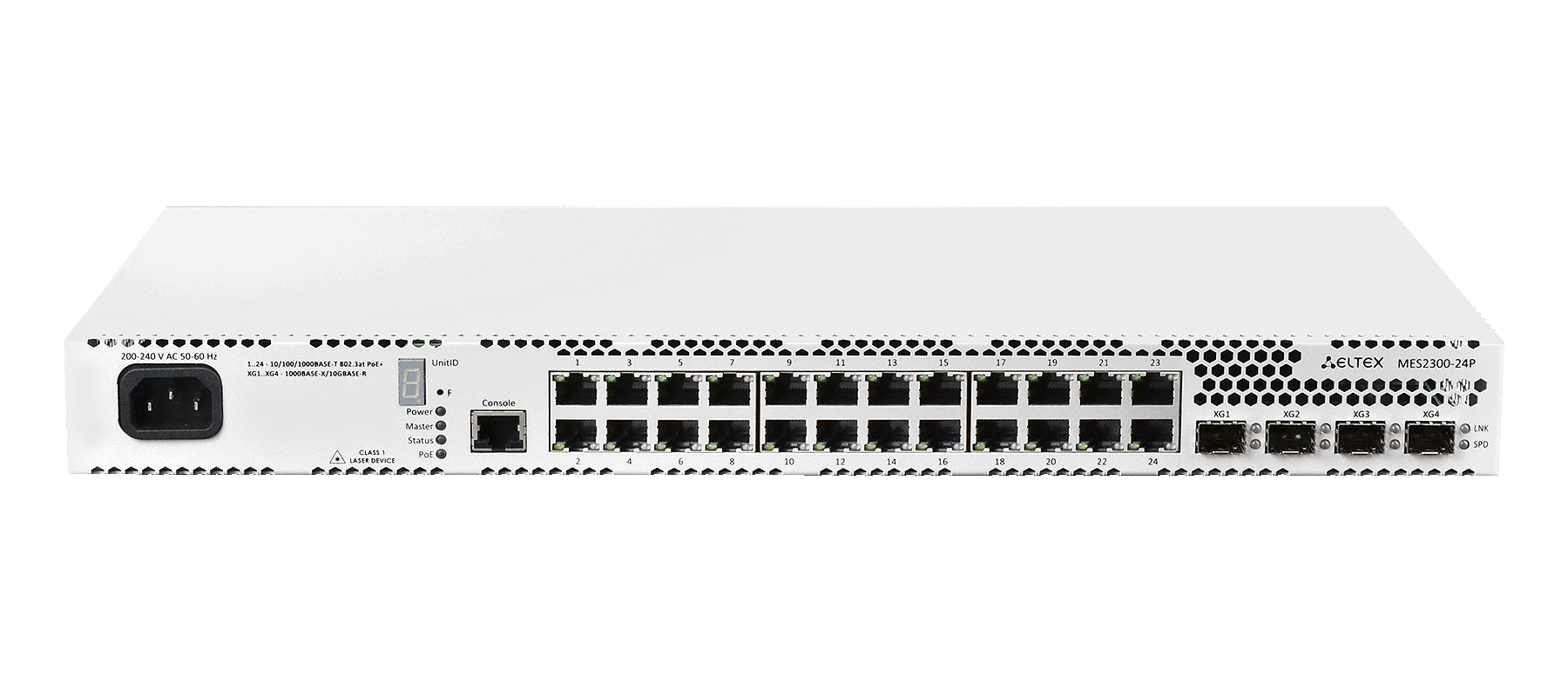 Коммутатор MES2300-24P с поддержкой PoE (Power over Ethernet) предназначен для обеспечения доступа к сети конечных пользователей в крупных предприятиях, организациях малого и среднего бизнеса, а также сетях операторов связи. Он оснащен интерфейсами 1G/10G, что позволяет обеспечить высокую пропускную способность и гибкость подключения.