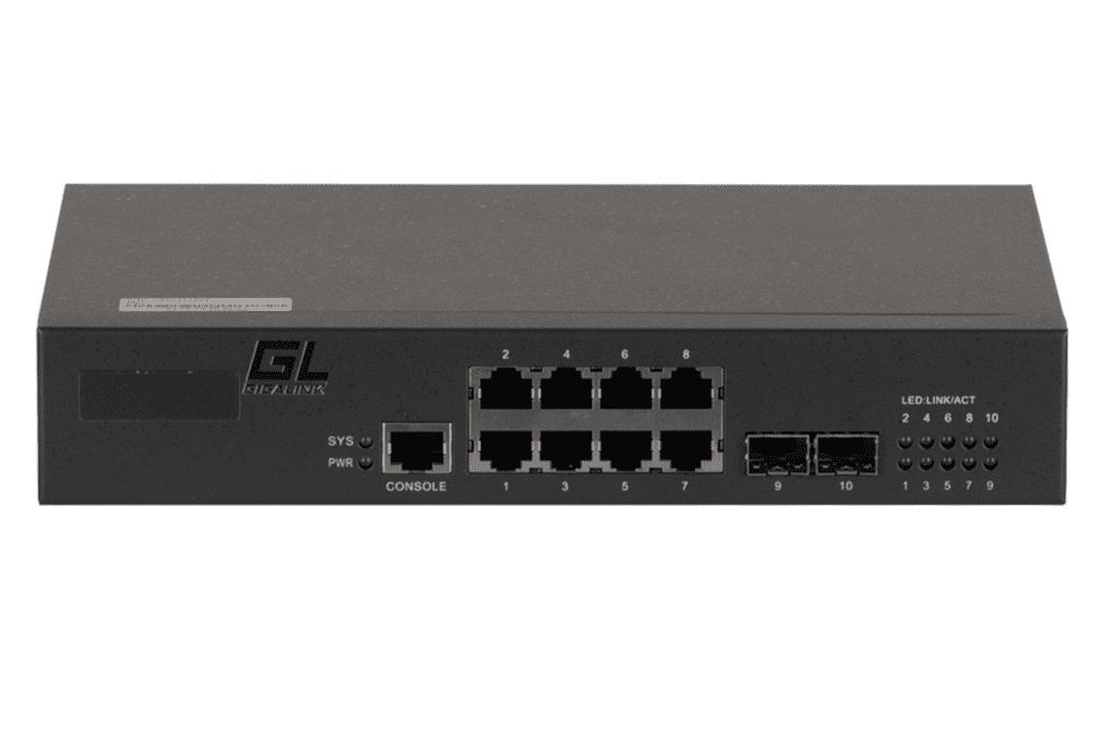 Управляемый коммутатор GIGALINK, L2, 8 10/100/1000Мб/с BASE-T, 2 SFP 1000 Мб/с Base-X, 1 консольный порт