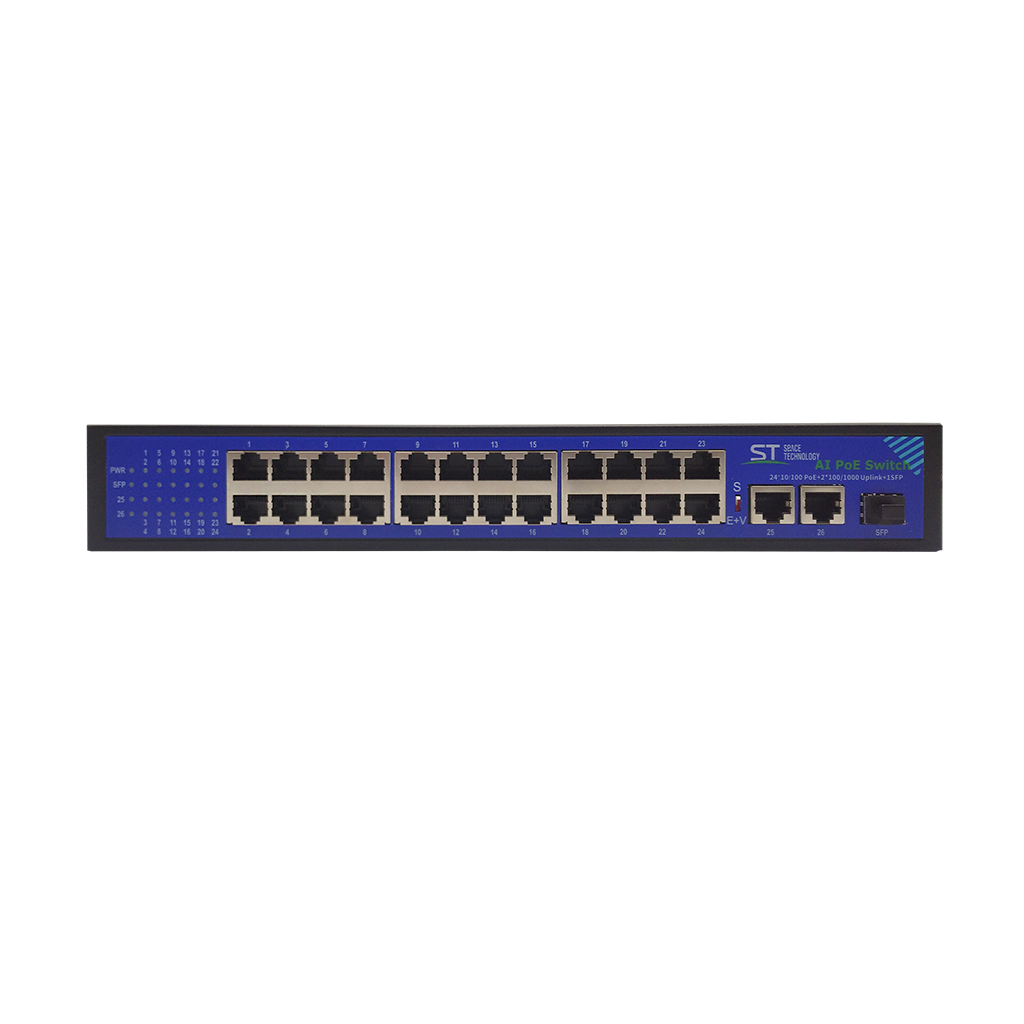 Источник питания ST-S244POE, (2G/1S/340W/A) PRO, Switch POE 24-х портовый для обеспечения проводных сетей напряжением 48В , защита от КЗ, Extend 250м., AI PoE, AI QoS, VLAN, Грозозащита, PoE порты: 24 х (10/100 Мбит/с), UpLink порты: 2 х(10/100/1000 Мбит/с), SFP порты: 1 х (10/100/1000 Мбит/с), Max.пропускная сп-ть: 100 Мбит/канал (PoE порты),1000Мбит/канал (UpLink порты), Uвых: 48 (±10%), Р(ном) каждый порт (Вт): 14 Вт, Р(макс) каждый порт (Вт): 30 Вт, Р(сумм) общая (Вт): 340 Вт, Тип РоЕ: А, Коммутационная способность (Гбит/с): 12,8 Гбит/с, AI PoE(watchdog), VLAN, Extend, Qos, Система охлаждения: пассивная, МЕТАЛЛ, Температура эксплуатации: От -45°C до +55°C, Габаритные размеры ИП: 310х182х45 мм