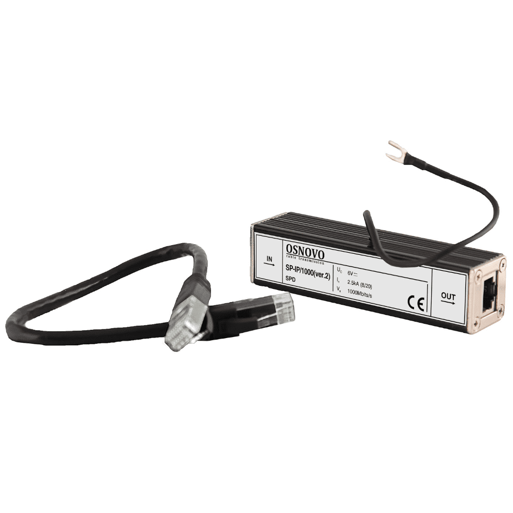 Устройство грозозащиты Osnovo SP-IP/1000 (ver2) предназначено для защиты от кратковременных скачков напряжения, синфазных перенапряжений и для фильтрации высокочастотных помех низковольтной аппаратуры систем IP-видеонаблюдения и GE LAN. Форма волны тока при импульсном перенапряжении — 8/20 мкс. Номинальный ток пробоя — 2.5 кА. Время срабатывания «линия – линия» ?1 нс.