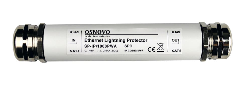 Устройство грозозащиты Osnovo SP-IP/1000PWA адаптировано к круглогодичной уличной эксплуатации: корпус защищен от пыли и влаги по стандарту IP67, рабочая температура — –40 °C… +80 °C.