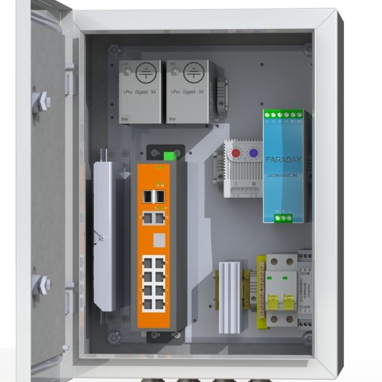 Шкаф также включает четыре порта SFP с скоростью 1000 Мб/с, бюджет PoE 230 Вт и поддержку передачи PoE на расстояние до 250 метров. В комплект входит блок питания мощностью 240Вт/48-58 В, обогреватель мощностью 50 Вт, сдвоенный термостат, оптический кросс на четыре порта SC, гермовводы (четыре PG9 и четыре PG13.5), автоматический выключатель на 6А,