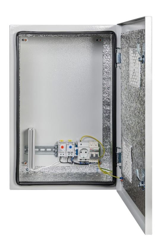 Навесной климатический шкаф с монтажной плитой оснащен двумя гермовводами типа MG-25. Внутренние габариты шкафа составляют 377х577х190 мм (ширина х высота х глубина). Шкаф соответствует степени защиты IP54 и способен функционировать в температурном диапазоне от -55 до +50°С. Внешние размеры: 400х600х220 мм (ширина х высота х глубина), масса – 11,8 кг. Цвет шкафа – серый.