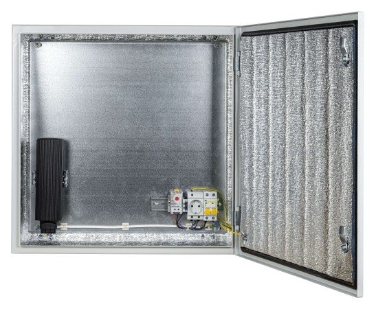 Климатический навесной шкаф. Комплектация: утеплитель из порилекса НПЭ, замок 2 шт., ключ 1 шт., монтажная плата 1шт., люк под гермовводы 1 шт., гермовводы 5 шт., розетка 1 шт., автомат.выключатель 1 шт., термореле 1 шт., нагреватель Р=150 Вт 1 шт; IP66, t-раб. -55...+50°С; внутр.размер (ШхВхГ) 577х577х220 мм, внеш.габариты (ШхВхГ) 600х600х250 мм; вес 23 кг, цвет ral 7035 (серый)