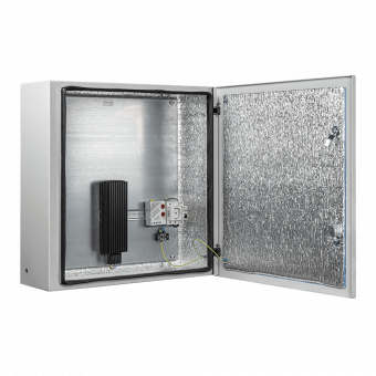 Шкаф изготовлен из листовой стали марки Ст3 толщиной 2 мм. Для контроля температуры и влажности предусмотрена система, включающая в себя электронный гигростат NT 78-M с функцией автоматического включения обогревателя HG 140 мощностью 150 Вт при необходимости. Система также оснащена автоматическим выключателем на 10 А. Оборудование устанавливается на DIN-рейку, а для подключения предусмотрена DIN-розетка с заземлением, два гермоввода MG-25 (полиамид, IP68) и клеммная колодка.