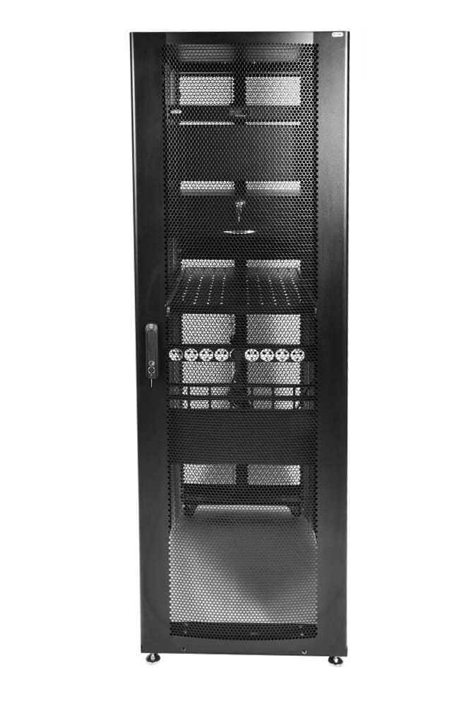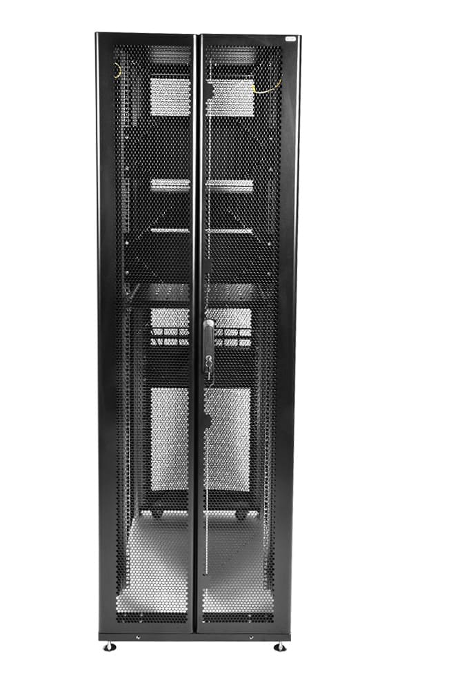 Напольный серверный шкаф ЦМО ШТК-СП-42.6.12-44АА-9005 высотой 42 U, шириной 600 мм, глубиной 1130 мм, полезной (между закрытыми дверьми) глубиной 890 мм изготовлен из листовой стали толщиной до 2 мм. Выполнен в типоразмере 19" по по ГОСТ 28601-90 (МЭК 297). Представляет собой сборно-разборную конструкцию, состоящую из каркаса, крыши, четырех боковых стенок, перфорированными задней и передней дверьми. Съемные боковые стенки и две двери обеспечивают доступ к оборудованию с четырех сторон.