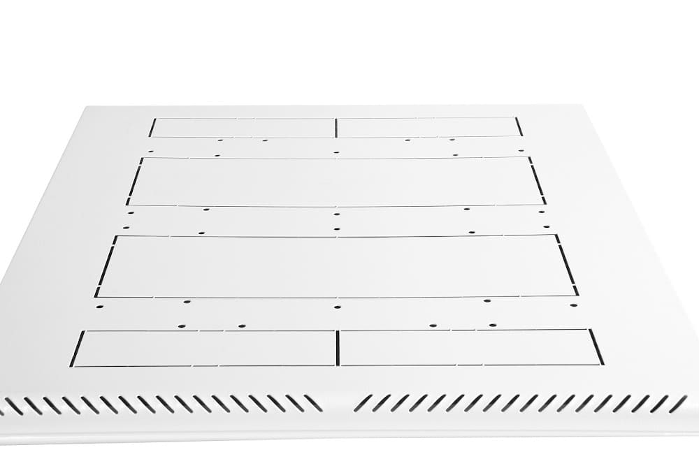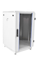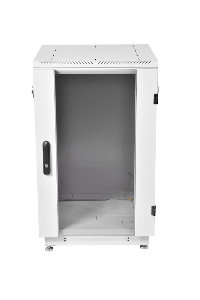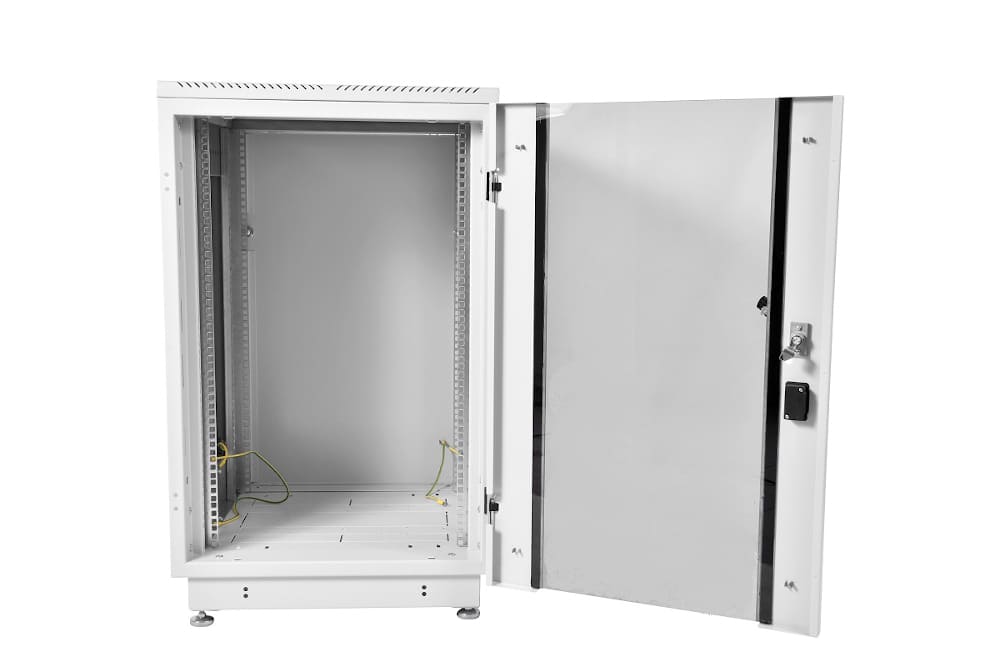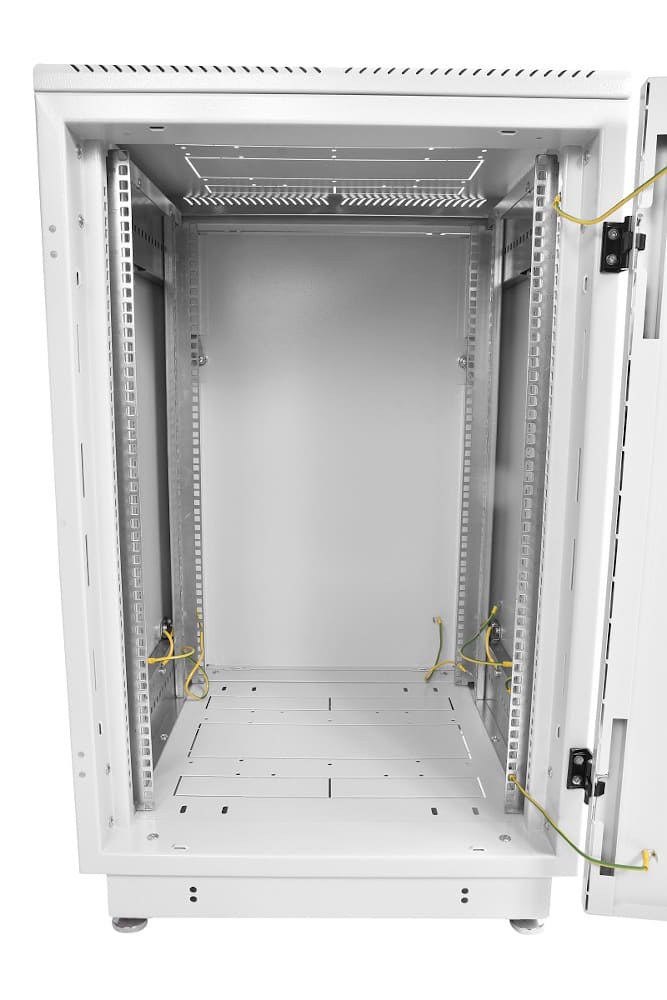 Поставляется с винтовыми опорами, компенсирующими неровности пола. Листовые детали покрыты полимерной шагреневой порошковой краской черного (RAL 9005) цвета, направляющие оцинкованы. Габариты шкафа — 600?800?960 мм, вес — 56.16 кг.