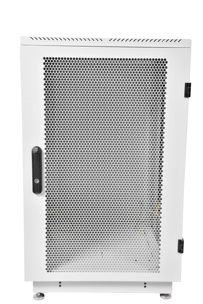 Шкаф оснащен усиленным точечным дверным замком с удобной ручкой, точечными замками и пластиковыми защелками на стенках. Площадь перфорации двери составляет 59%, а по периметру крыши - для обеспечения дополнительной естественной вентиляции. Общая площадь перфорации - 67%.