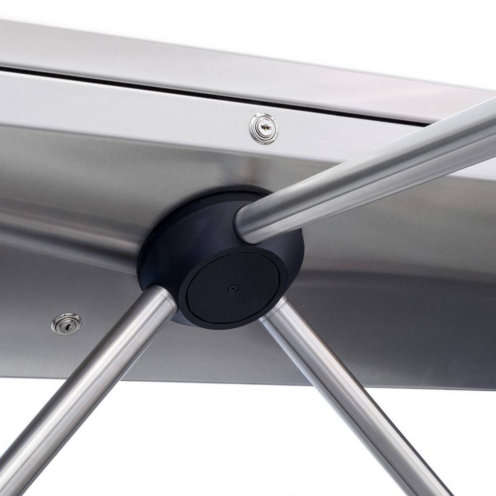 Нормально-закрытый тумбовый турникет-трипод PERCO TTD-03.2S с корпусом и крышкой, выполненными из шлифованной нержавеющей стали, предназначен для работы в помещении, поставляется с электронной платой, поддерживает проход в двух направлениях, механические планки «антипаника»(планки выбирают при заказе).