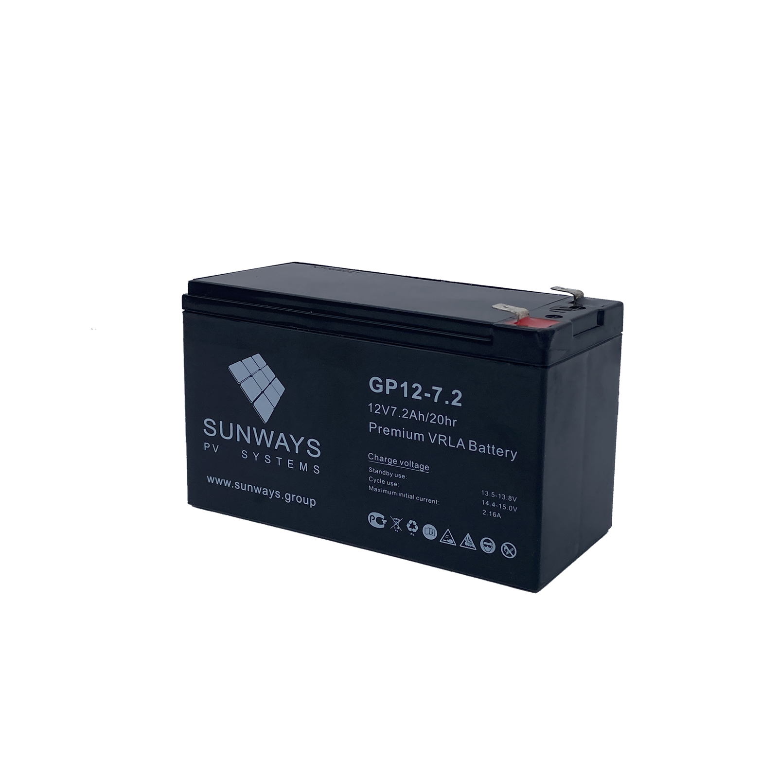 Аккумуляторные батареи Sunways серии GP являются универсальными и предназначены для работы в охранных, пожарных, солнечных энергосистемах, системах бесперебойного питания и ветрогенераторных установках. Корпус таких батарей полностью герметичен и выполнен из негорючего ABS пластика, что исключает возможность выделения кислотных паров и водорода. Это позволяет отнести батареи к необслуживаемым и эксплуатировать их внутри жилых и офисных помещений. При производстве аккумуляторов применена технология AGM (Absorbed Glass Mat). Они предназначены для работы как в циклическом, так и буферном режиме. Аккумуляторные батареи серии GP – одно из лучших предложений на рынке благодаря продолжительному сроку службы (10 - 12 лет), улучшенным зарядным характеристикам, абсолютной герметизации корпуса и доступной цене.
