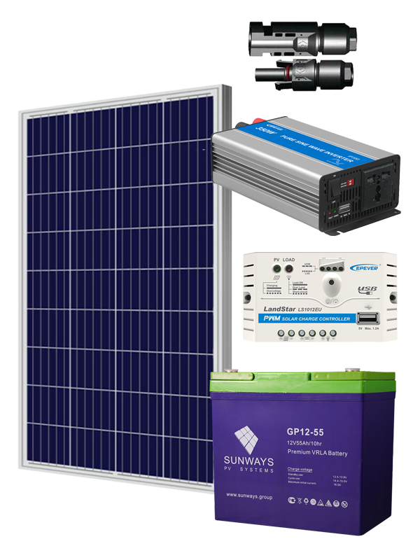 Комплект состоит из солнечного модуля FSM-100M, инвертора Cotek S300 12В, контроллера EPSolar LS1012E, АКБ OSB 72Ah AGM 12V, коннекторов солнечных модулей МС4.