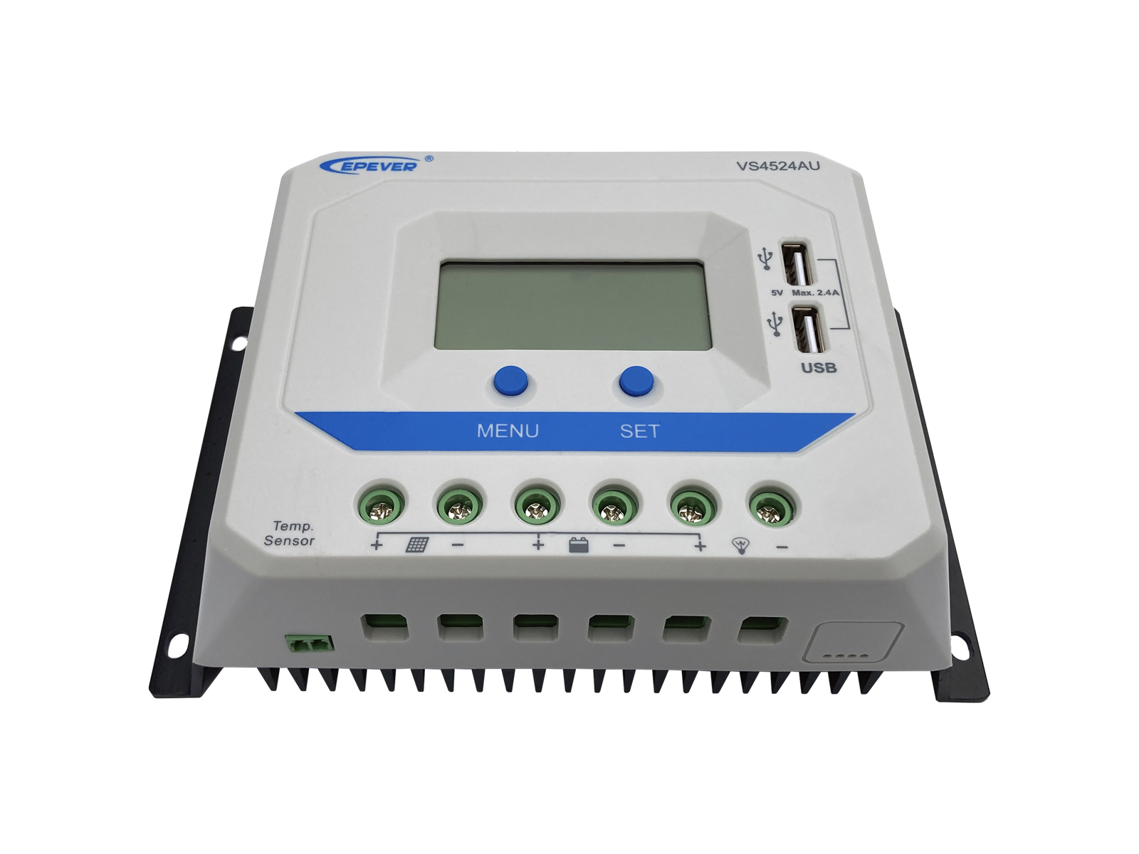 Контроллер заряда VS4524AU имеет встроенный ЖК-дисплей и USB-порт. Предусмотрено несколько режимов управления нагрузкой, позволяющих применять контроллер в солнечной домашней системе, системе безопасности, автономной системе освещения и т.д. Электроэнергия от модуля, может передаваться аккумуляторам без регулирующих устройств или через контроллер.
