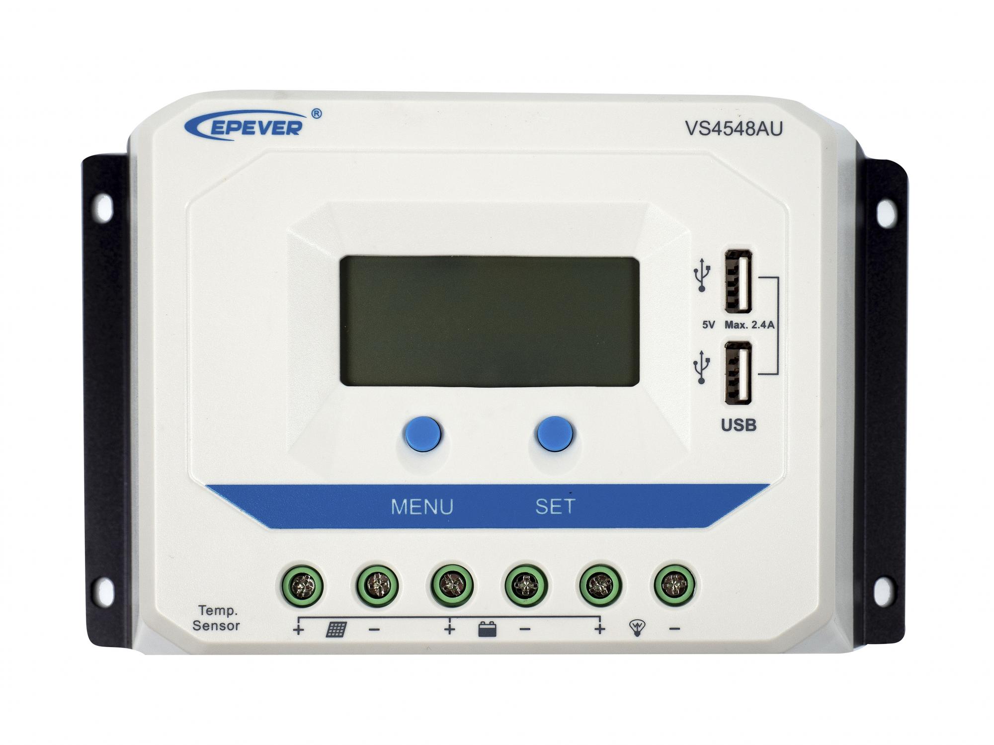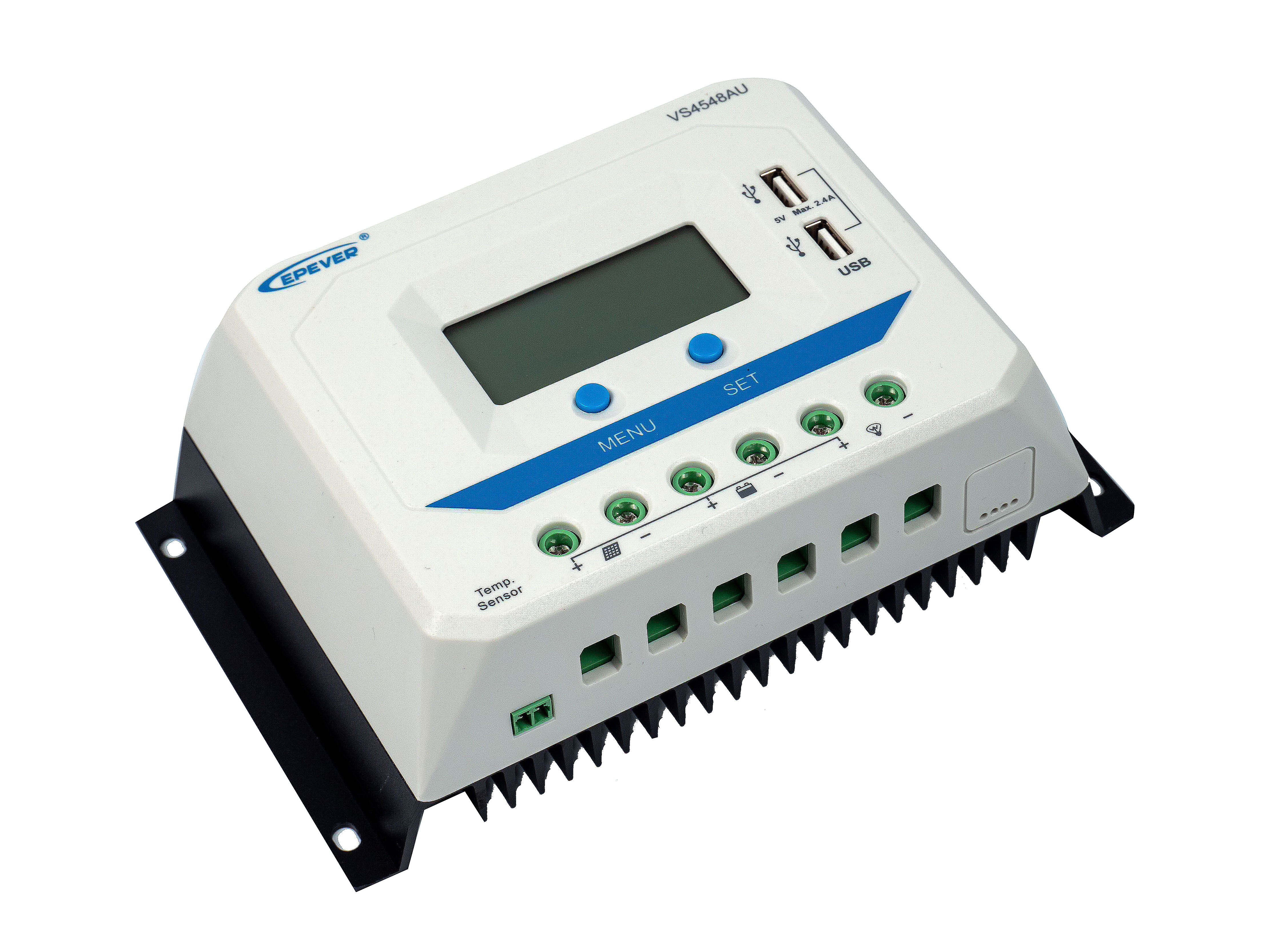 Контроллер заряда VS4548AU имеет встроенный ЖК-дисплей и USB-порт. Предусмотрено несколько режимов управления нагрузкой, позволяющих применять контроллер в солнечной домашней системе, системе безопасности, автономной системе освещения и т.д. Электроэнергия от модуля, может передаваться аккумуляторам без регулирующих устройств или через контроллер.